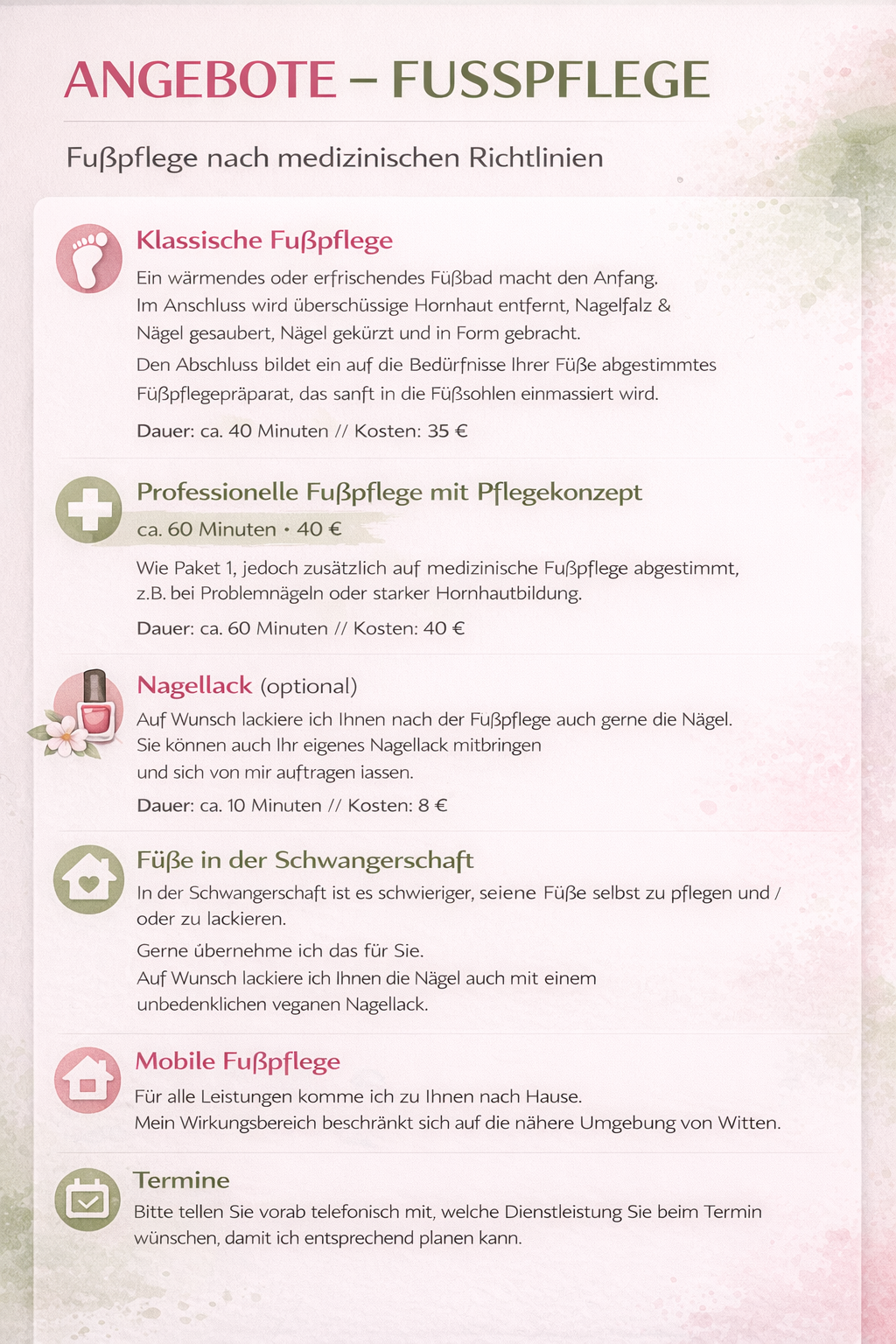 Entdecken Sie meine umfassenden Fußpflegeangebote, die Gesundheit, Schönheit und Wohlbefinden verbinden.